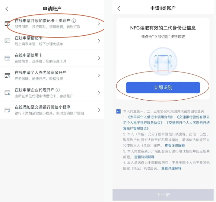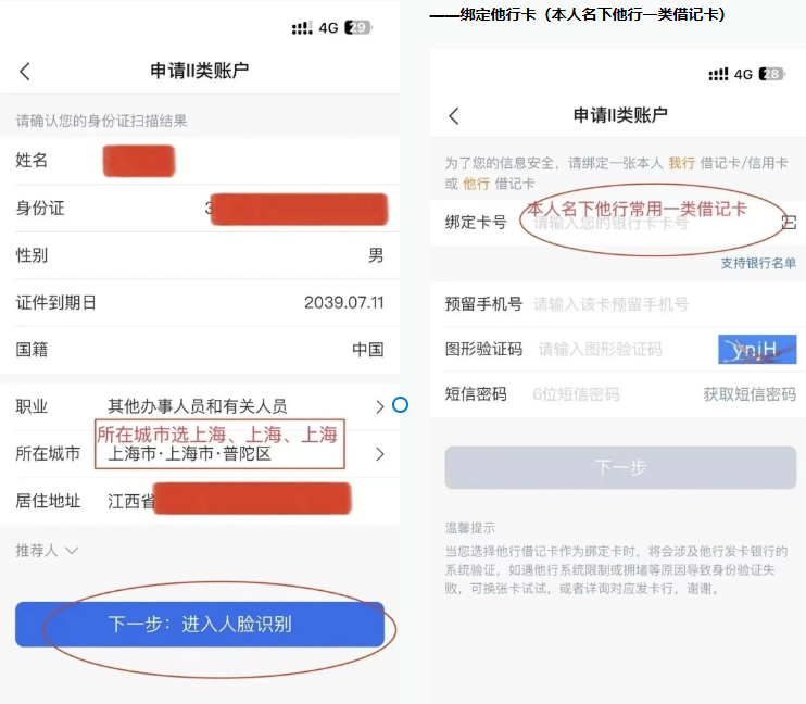 2、app首页 左上角 账户账户申请在线申请并添加借记卡II类账户NFC识别身份证所在城市选【上海、上海、上海】!(上海二类户可一次性转出,其他城市二类户限额)