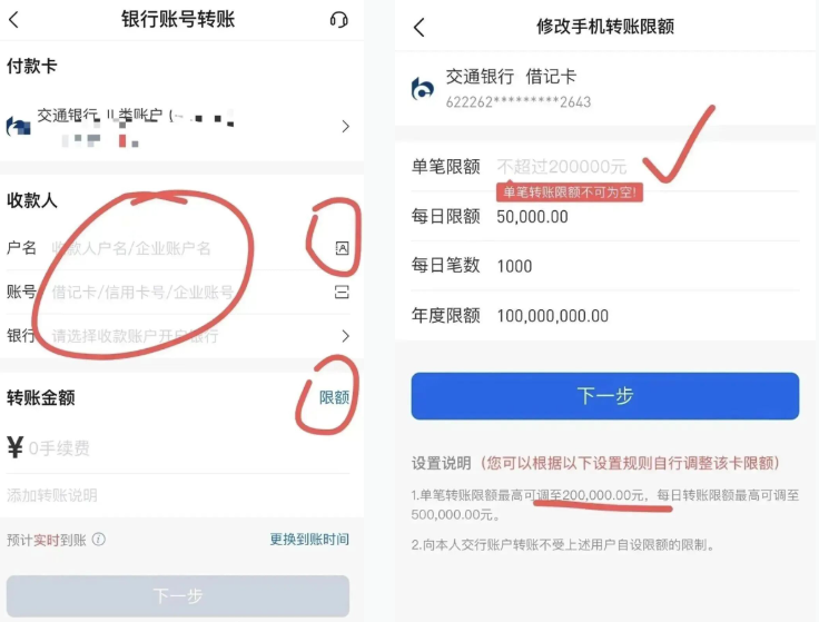 ——立即开通转账功能设置限额(单笔改20万,单日50万)