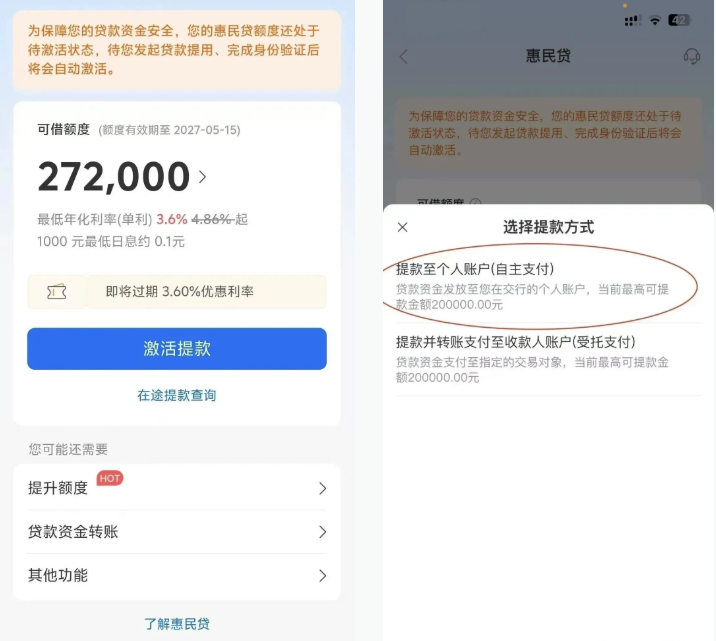 3、提款转账二类户开好后点完成 回首页 进入“惠民贷”页面,激活提款——提款至个人账户