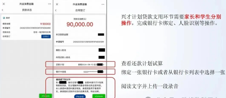 ——核批额度,家长和学生分别扫码/空手到App/微信公众号绑卡、人脸提款。
