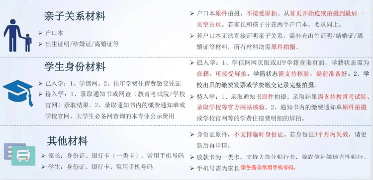 家长:身份证、银行卡(一类卡)、家长常用手机号、户口本