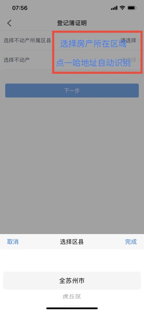 | 4.选择房产所在区域,再点”选择不动产“自动识别名下房产,确认 |