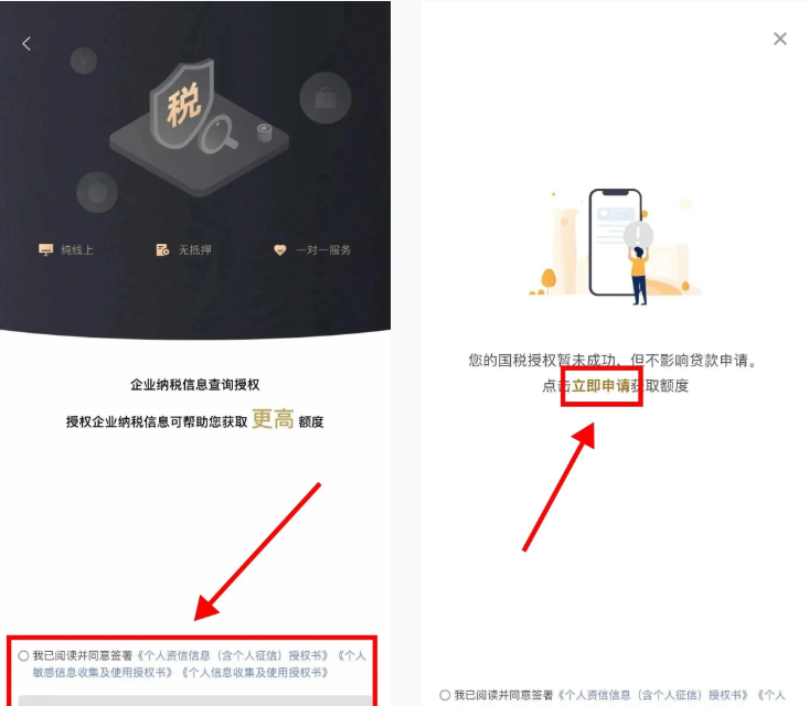 ——根据系统提示,完成认证国税信息;如果没有纳税,可跳过授权,不影响后续申请(但额度可能较低)