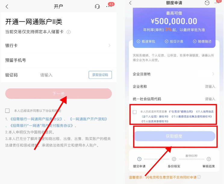 ——若预审通过,但申请人无招商银行一类卡,需先到线下网点办理实体一类卡办理完成后,APP 首页会显示获批额度、利率、提款入口及 “申请调额” 选项(可补充资产信息进一步提额)