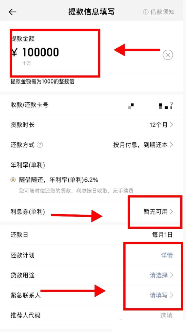 ——点击 “去提款”,输入借款金额(需为 1000 的整数倍,不超过获批额度)选择收款 / 还款卡号(需为招商银行一类卡)、贷款时长(12/24/36 期)、还款方式填写贷款用途、紧急联系人信息,确认无误后提交,等待资金到账(一般当天到账)。