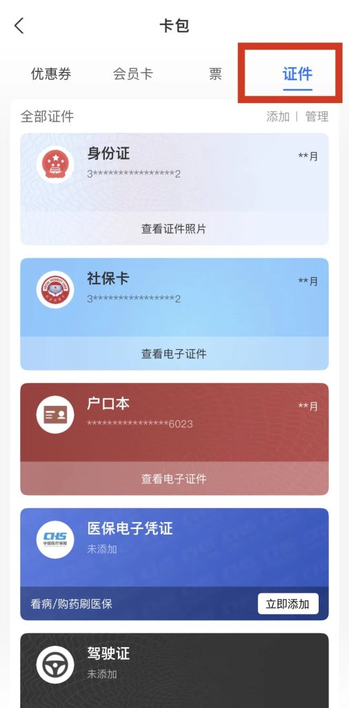 2.进入卡包后,点证件,往下拉,到“户口本”,人脸识别