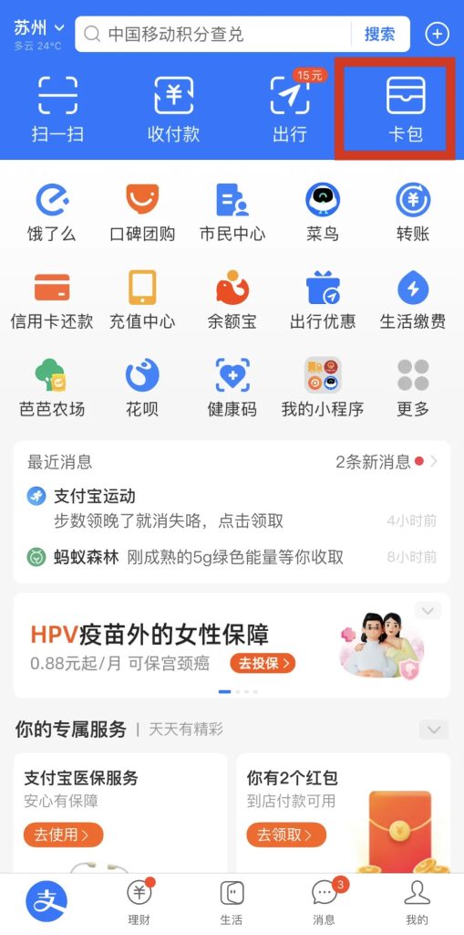 1.打开支付宝,点“卡包”