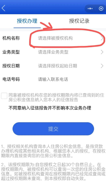 ⑤在“授权办理页”依次选择“机构名称”、“业务类型”、“授权日期”,填写“电话号码”