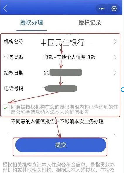 填写“联系电话”。勾选“同意被授权机构在您的授权期限内将已查询到的住房公积金信息纳入您本人的征信报告”,点击“提交”。完成身份核验后,提交成功。