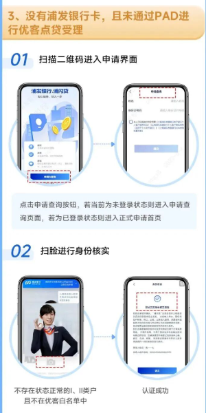 有浦发银行卡用户:微信扫描二维码进入申请页面—系统会自动验证一类或二类账户信息,进入授信申请流程—在产品申请页面填写个人相关信息—进行人脸识别验证,确保身份真实—签署相关授权书—完成申请后,跳转至首页进行最终确认。