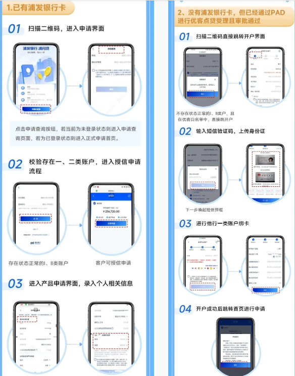 无浦发银行卡用户:首先通过手机扫码开二类户后——扫描二维码,进入开户页面——输入短信验证码并上传身份证信息——完成他行一类账户绑卡操作——开户成功后,返回首页进行贷款申请。