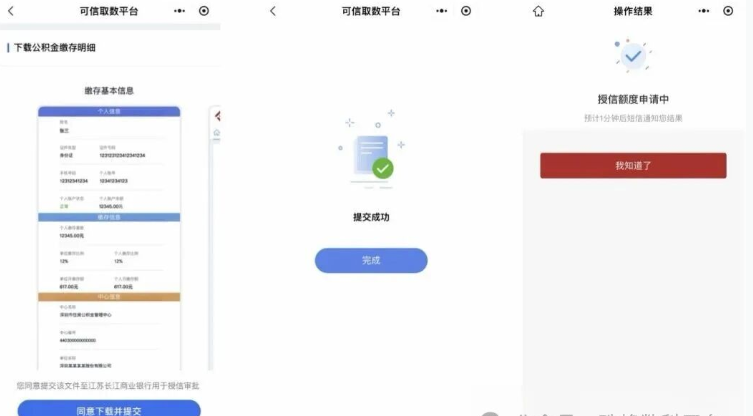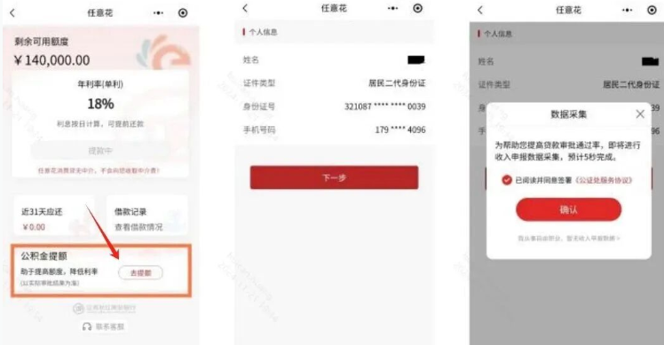 公积金提额页面:提交过程页面、授信通过后页面均有入口;实时审批,结果有短信提醒
