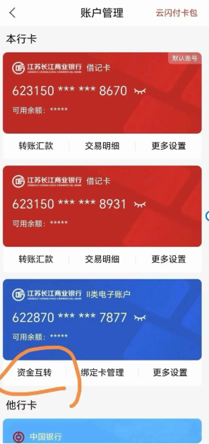 江苏长江商业银行APP:【手机银行-我的-账户管理-资金互转】